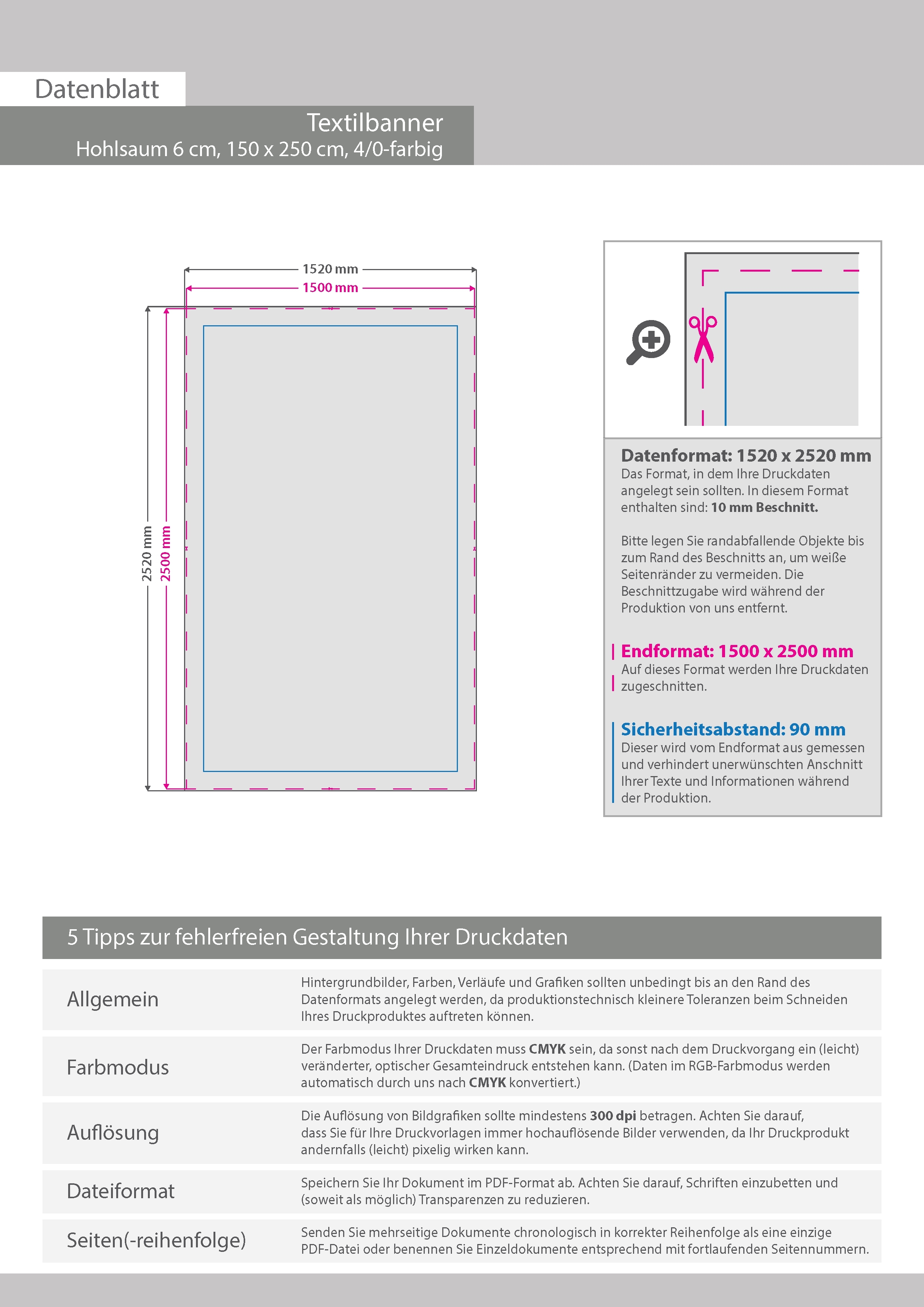 Hochwertige Stoff-Banner 150 x 250 cm, 4/0-farbig bedruckt, Hohlsaum oben und unten (Durchmesser Hohlsaum 6,0 cm)