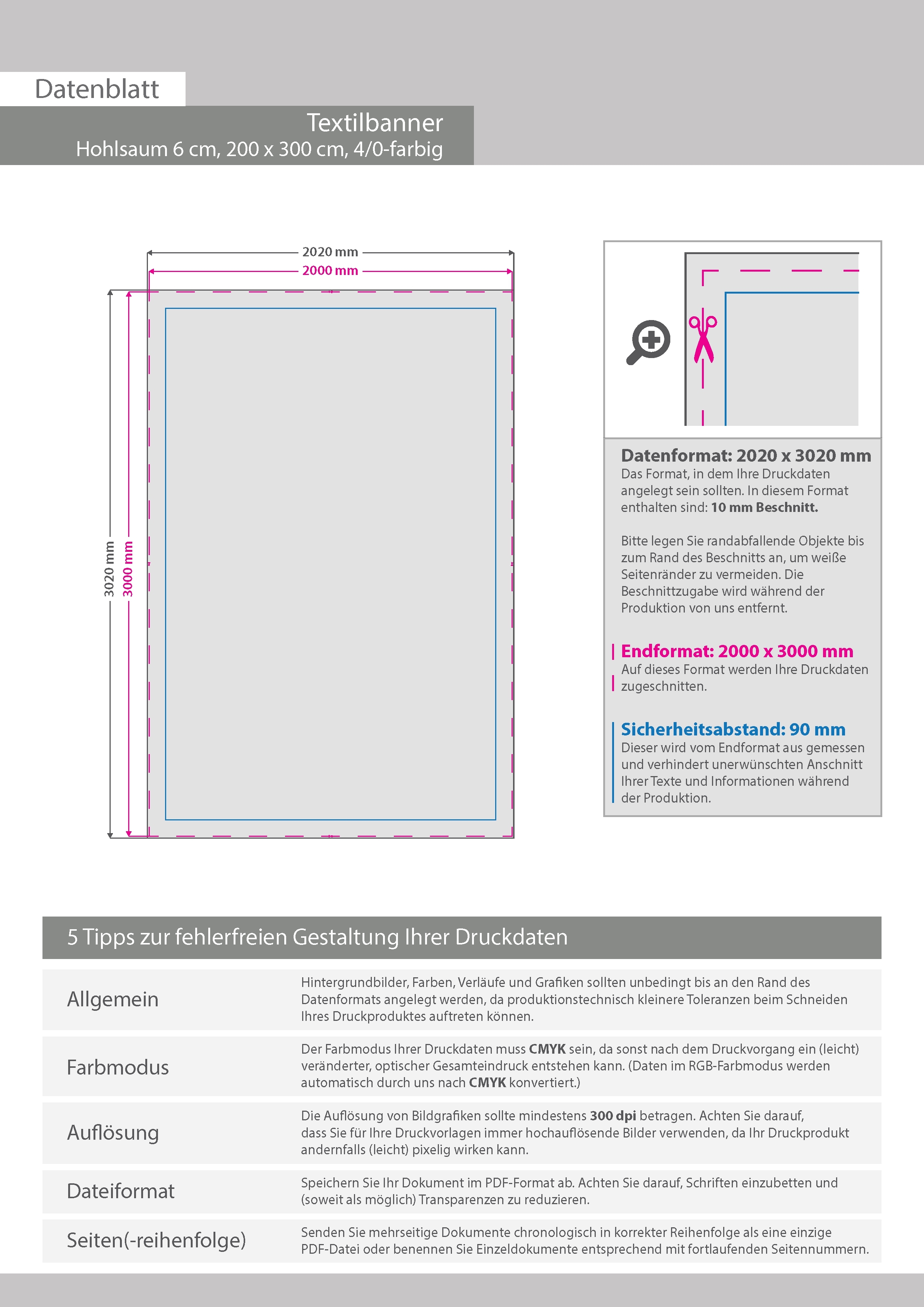 Hochwertige Stoff-Banner 200 x 300 cm, 4/0-farbig bedruckt, Hohlsaum oben und unten (Durchmesser Hohlsaum 6,0 cm)